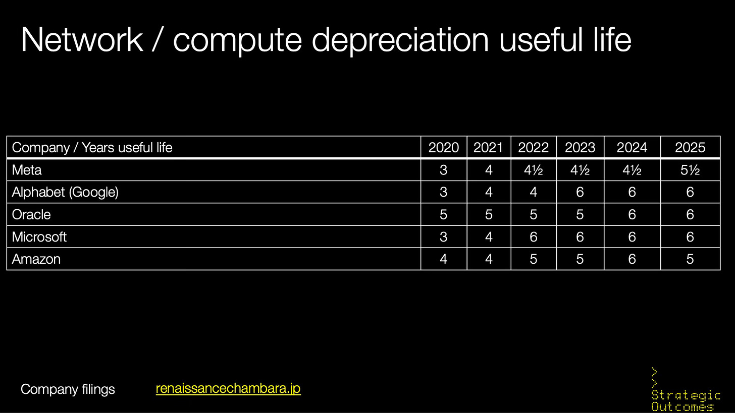 There is an added wrinkle in this last point about the useful life of GPUs and TPUs. Company filings of hyperscalers show that they are amortising their network and compute capital expenditure over longer times, by lengthening the assumed useful lives of components in their financial paperwork.