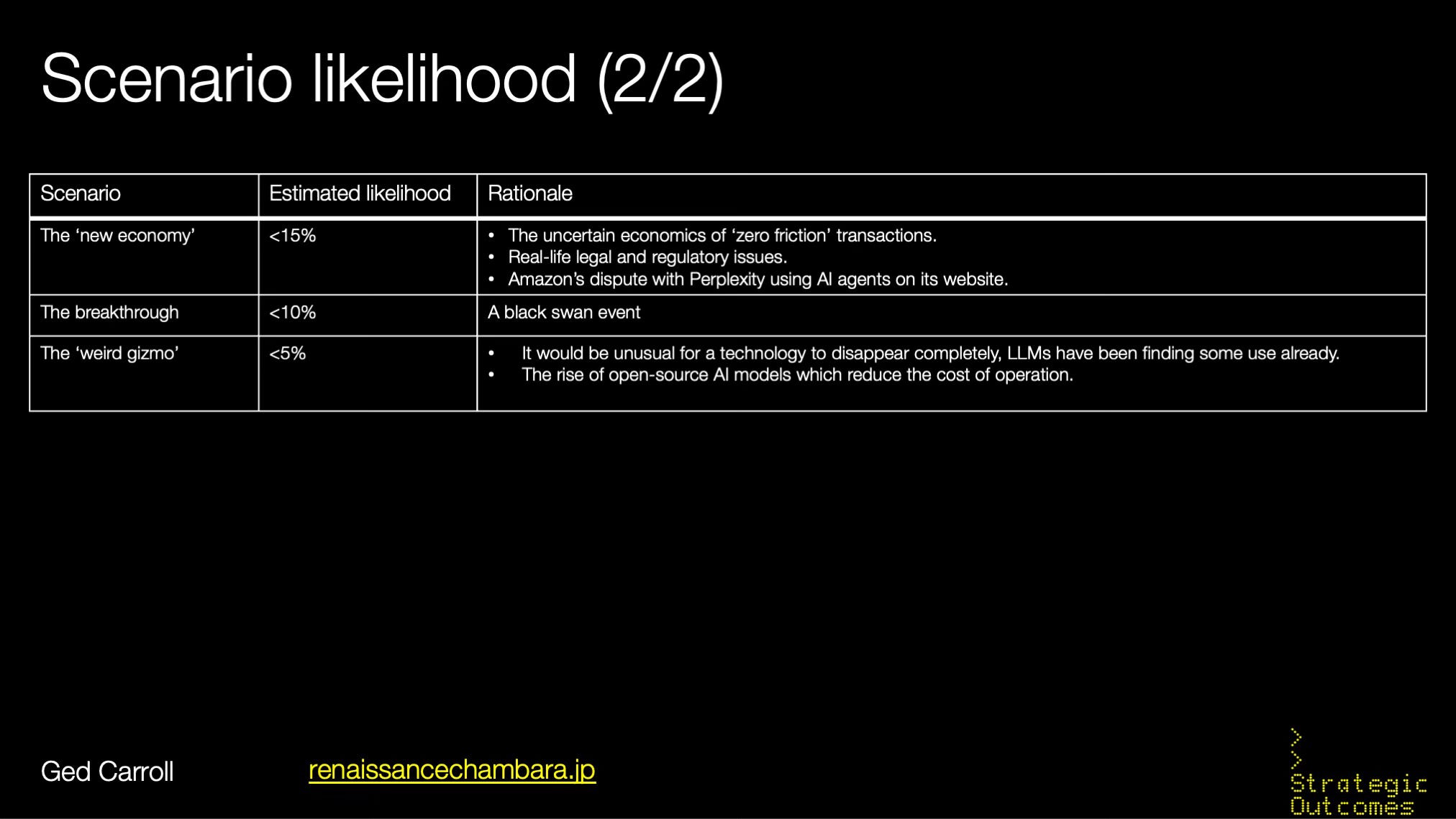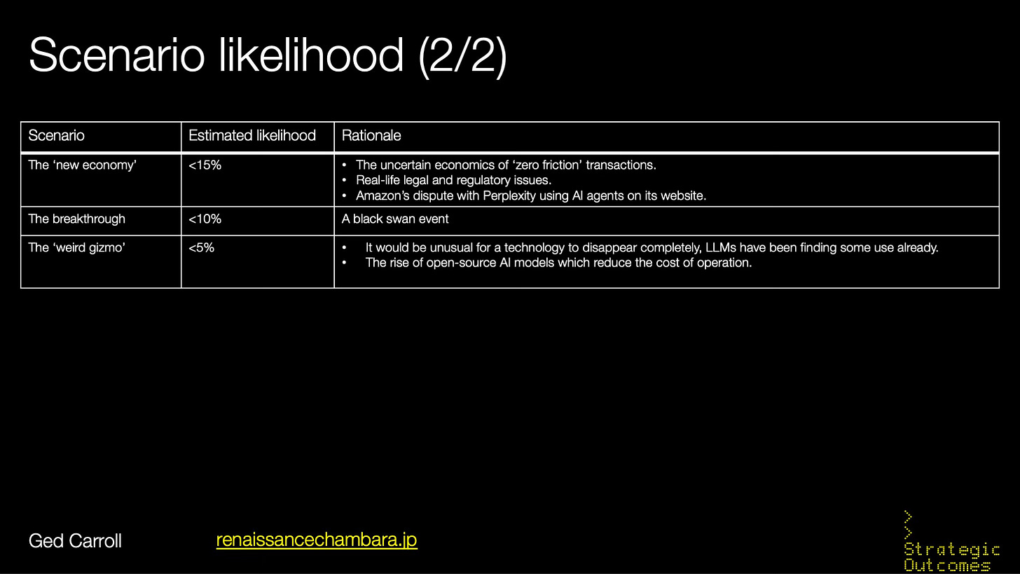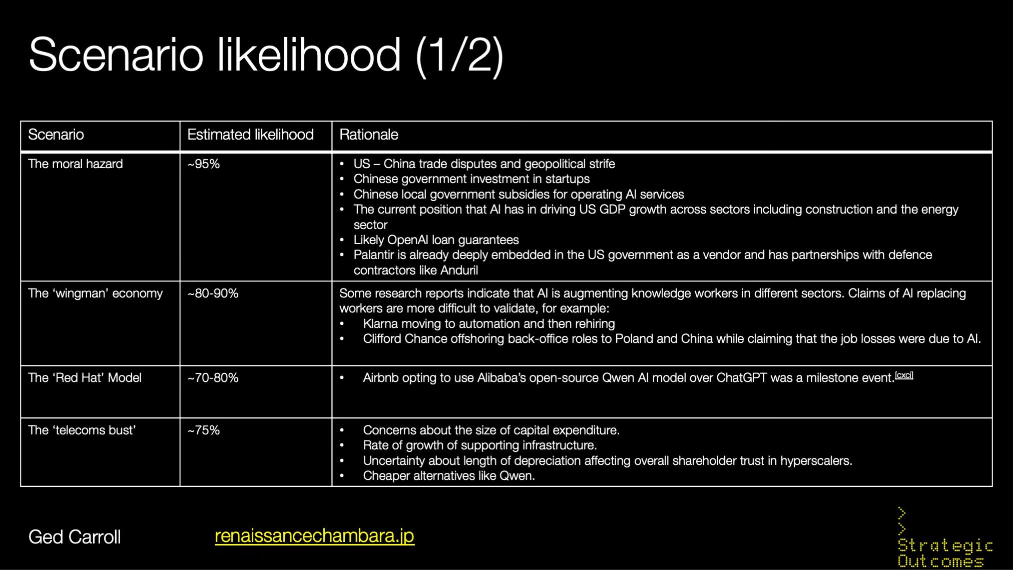 The document outlines seven possible scenarios for the era’s conclusion, ranging from The Breakthrough (total economic transformation) to The Weird Gizmo (total collapse). Currently, “The Moral Hazard”—where AI is deemed “too big to fail” and receives government backing—is viewed as the most likely path (~95% likelihood).