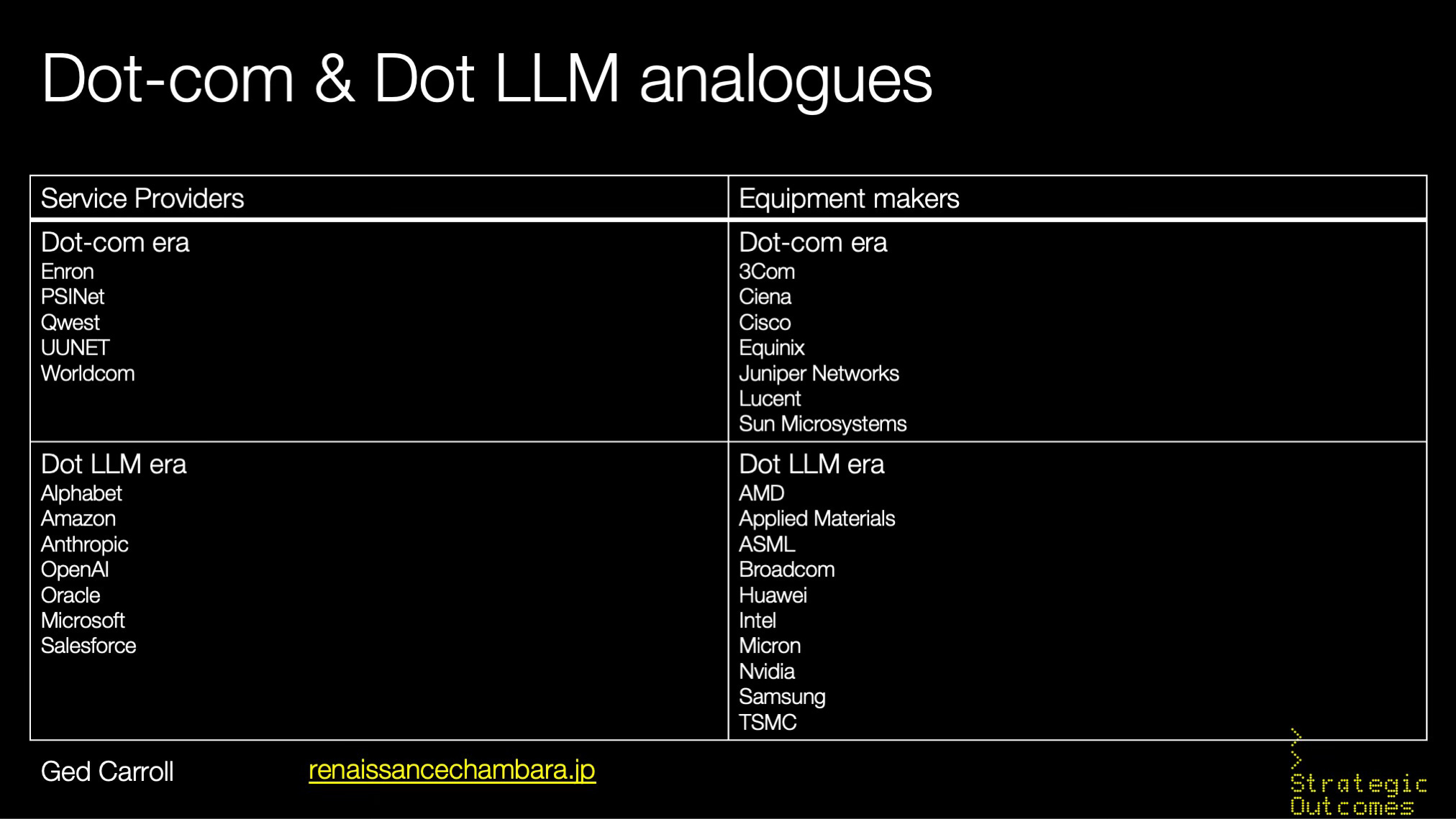 The dot LLM era hinges around service providers and equipment makers, in the same way that the telecoms bubble did. Here are some examples and their dot LLM analogues.