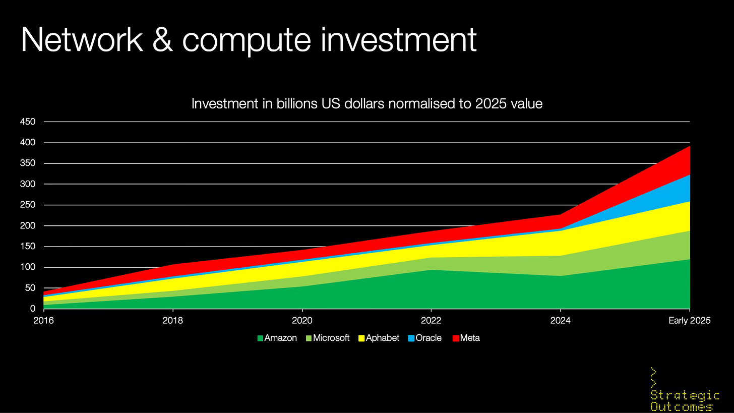 The scale of investment and construction of data centres together with the new electricity generating capacity to power them are orders of magnitude larger than the telecoms boom.
